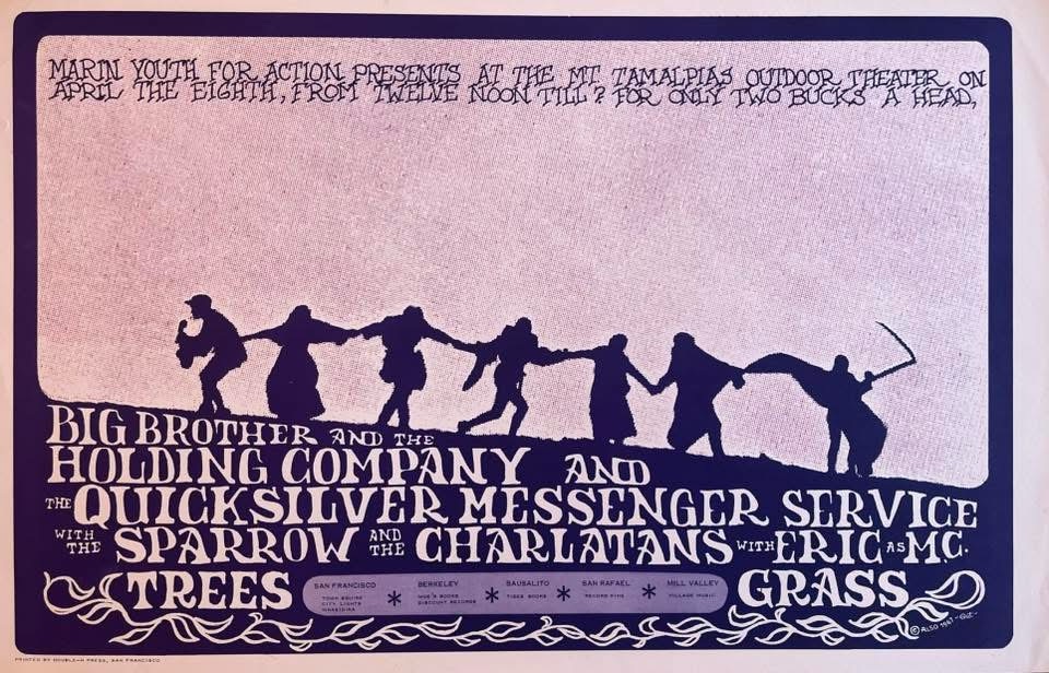 Quando lavora ai poster psichedelici per i concerti e le manifestazioni della San Francisco underground, la sua mano si riconosce immediatamente: le linee non cercano la bellezza, ma la tensione. Il suo tratto mescola la durezza metallica del mondo biker con i vortici lisergici del periodo. È un’estetica che sembra nascere da una collisione: il rombo del motore che incontra il trip acido, il teschio e la spirale, il bitume e il colore fluorescente. Un esempio emblematico di questa sintesi è il poster per il Death of Money March del 1966, un’azione dei Diggers in cui la critica al capitalismo assumeva la forma teatrale di un funerale pubblico per il denaro stesso.