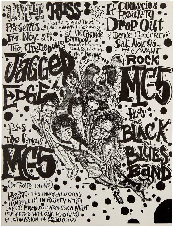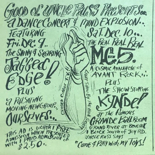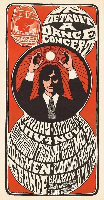 Nato e cresciuto nei quartieri operai della Motor City, Russ non proveniva dalle élite culturali. Era un figlio della working class, forse un ex operaio delle fabbriche o un reduce della Seconda Guerra Mondiale, con quel fisico tarchiato e lo sguardo furbo che tradiva anni di notti insonni a imbastire serate. Negli anni Sessanta, mentre la scena musicale di Detroit esplodeva con leggende come John Lee Hooker o i nascenti MC5 – quei teppisti del garage rock che urlavano contro il sistema –, Uncle Russ fiutò l’aria del tempo. Organizzava eventi nei posti più impensati: il Grande Ballroom, con i suoi soffitti altissimi e l’eco di bassi che facevano tremare i muri; o il Eastown Theatre, un vecchio cinema riconvertito in arena per concerti che mescolavano rhythm and blues, soul e proto-punk. Non si limitava a vendere biglietti: curava l’intera esperienza, dai poster psichedelici stampati in fretta e furia nelle tipografie underground ai roadie che scaricavano furgoni nel cuore della notte.